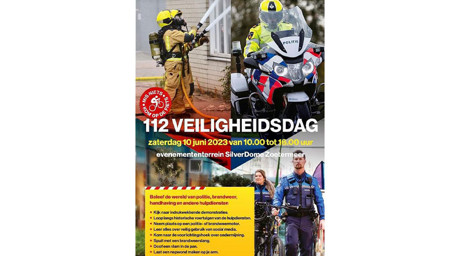 Beleef de wereld van politie, brandweer, handhaving en andere hulpdiensten! Op zaterdag 10 juni vindt de 112 Veiligheidsdag plaats op het terrein bij het SilverDome aan de Van der Hagenstraat. Van 10.00 uur tot 16.00 uur is er van alles te beleven op het gebied van veiligheid. Voor jong en oud! Er zijn spectaculaire demonstraties. Hoe werken hulpdiensten samen bij een ernstig verkeersongeluk? Hoe houdt de politie een gevaarlijke verdachte aan? Of leer een vlam in de pan te doven. Mis niets en kom op de fiets!