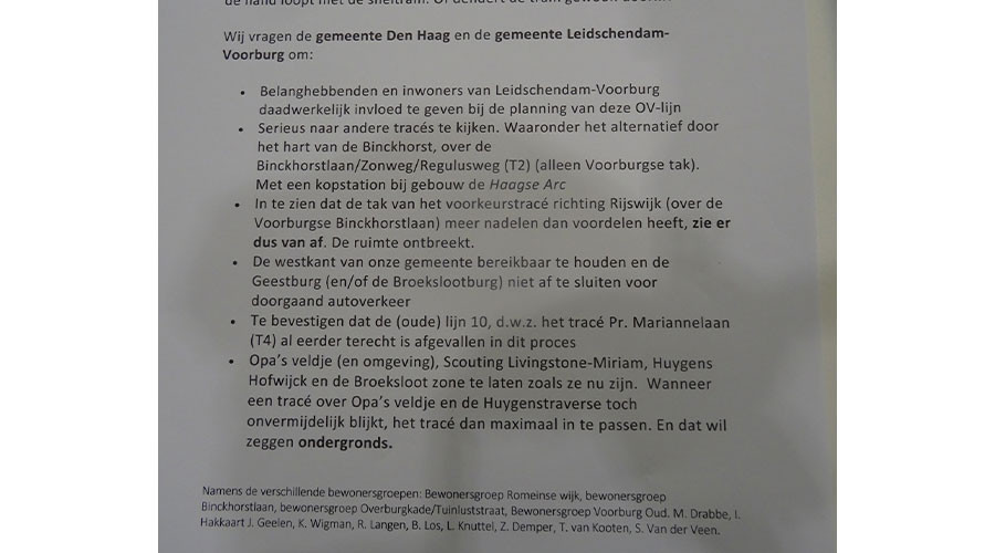 Het betoog van Robert Langen namens het Platform Beter Stedelijke en Regionaal Openbaar vervoer Haaglanden is weliswaar enigszins technisch samengesteld, maar de oproep aan de Zoetermeerse politiek is hoorbaar. Dit vinden ook diverse bewonersgroepen uit de gemeente Leidschendam- Voorburg.