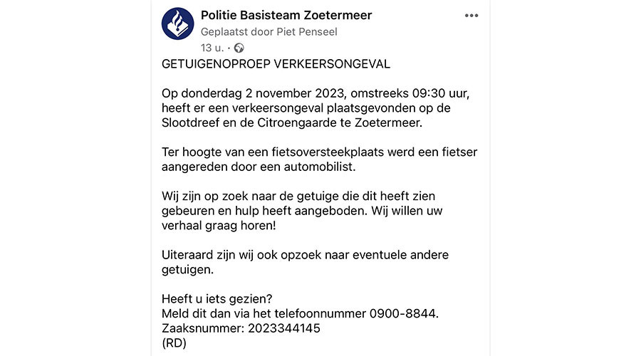 Politie Zoetermeer doet een getuigenoproep om meer inzicht te krijgen in een aanrijding.