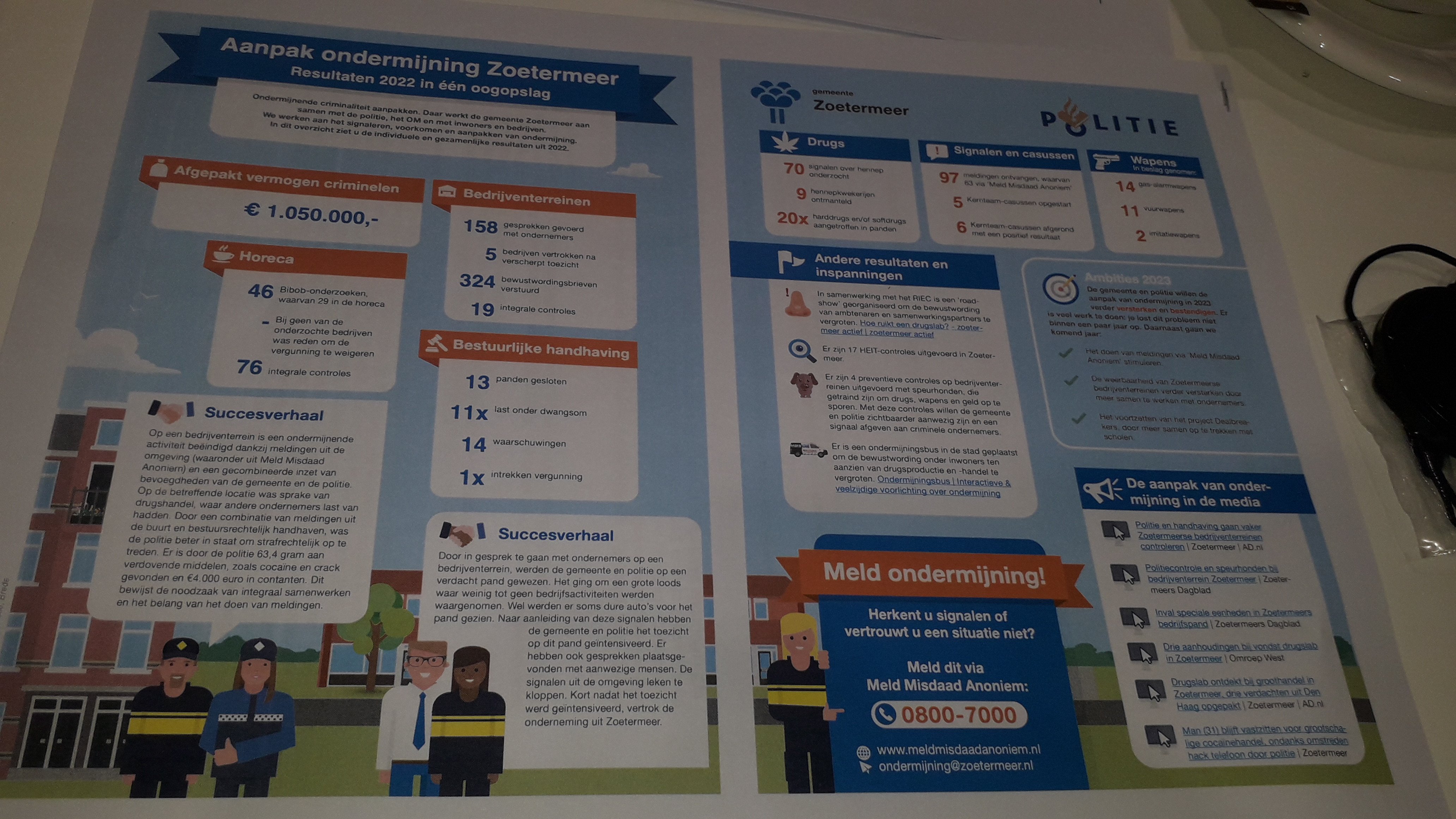 "Denk aan vormen van fraude, witwassen van geld en de handel in drugs. Daarbij ligt onze focus op horeca en bedrijventerreinen", vult burgemeester Michel Bezuijen aan. "Naast de controles op bedrijventerreinen is er ook veel geïnvesteerd in de bewustwording van inwoners en ondernemers. Zij zijn mede de oren en ogen in onze stad en zien en voelen het vaak al snel als er iets niet in de haak is. Met succes, zie daarom de resultaten van onze ondermijningsaanpak. Zo konden we na meldingen uit de omgeving ingrijpen bij een pand aan de Industrieweg waar sprake was van drugshandel. Vorig jaar is één miljoen vermogen afgepakt van criminelen in onze stad. Ook kenden we twee situaties waarin ogenschijnlijk malafide ondernemers de stad hebben verlaten".