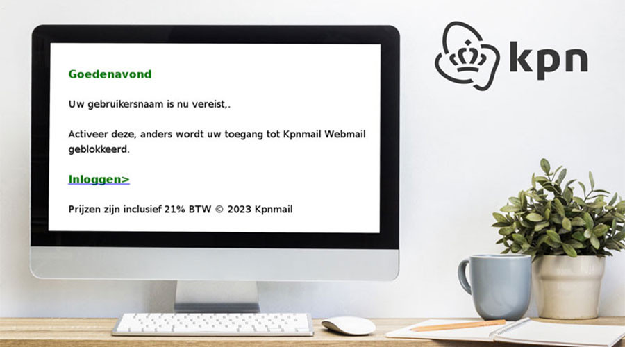 In deze phishingmail staan ook enkele taalfouten. Zo staat er geen komma achter ‘Goedenavond’ en een komma en punt achter “Uw gebruikersnaam is nu vereist.” Daarnaast is ‘Kpnmail Webmail’ dubbelop en verkeerd geschreven. De officiële schrijfwijze op de website van KPN is ‘KPN Webmail’.