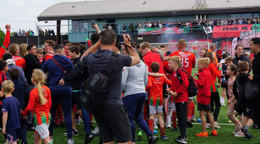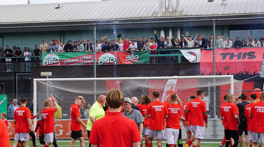 Na het fluistignaal ontstond bij DSO gisteren binnen en buiten de lijnen vanwege het kampioenschap een groot feest. Honderden mensen vierden de historische promotie mee naar de Vierde Divisie.